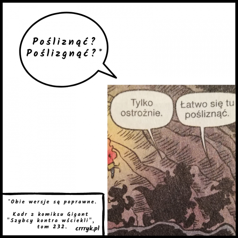 Nie znam nikogo, kto, upadając, myśli o języku polskim. I dobrze, wszak dzieją się wtedy znacznie ważniejsze rzeczy 😉 Ale już opowiadając komuś o swojej przygodzie, można się zastanawiać, która forma jest właściwa. A właściwe są dwie, bo nasz język to kocha 🙂 Niezależnie czy to będzie pośliźnięcie, czy poślizgnięcie uważajcie na siebie w nadchodzącym…